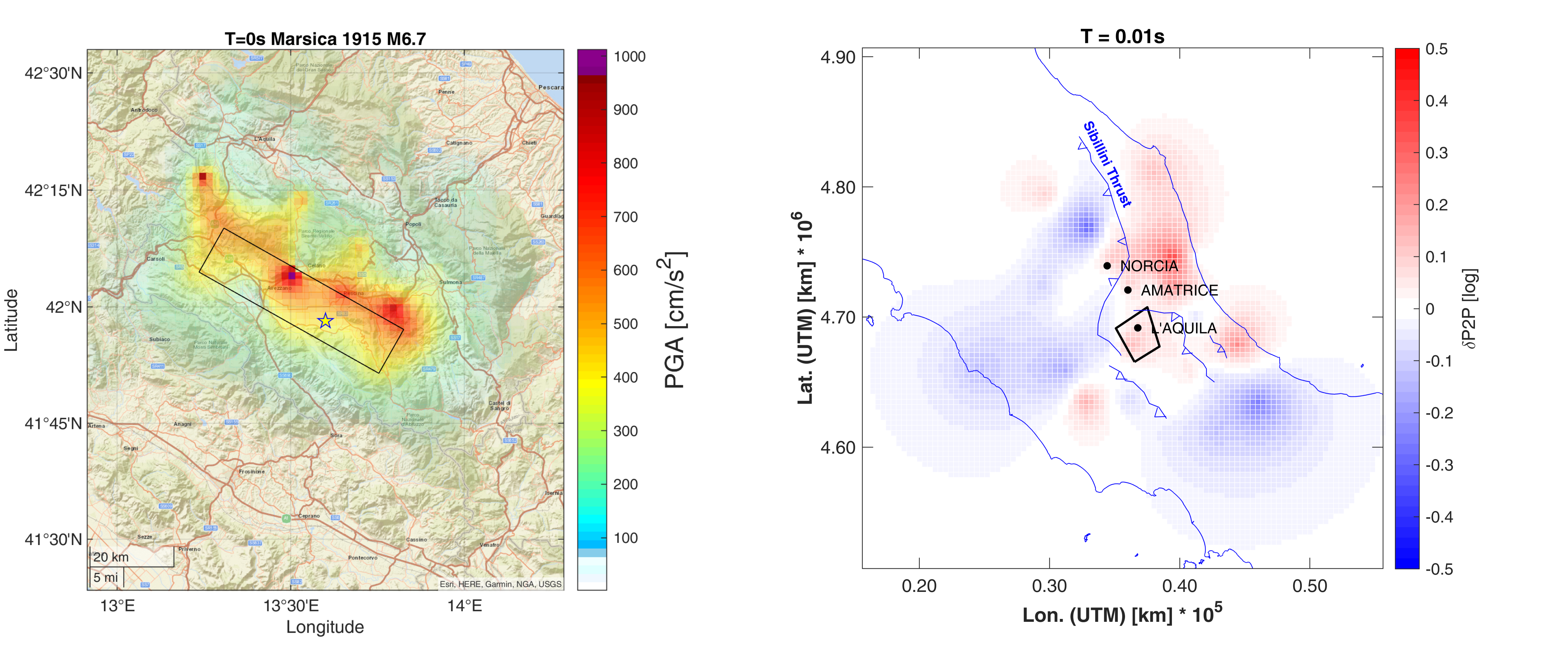 Figure: Example of shaking field at PGA (horizontal components) for the Marsica 1915 earthquake (on the left) and map of the propagation effects (on the right).