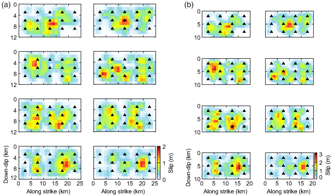 Figure: The eight slip distributions associated with the simulated rupture scenarios obtained by changing the distribution of sub-sources for fault sizes a) 25x12 km2 on the left and b) 20x10 km2 on the right. From Cejka et al (2024).
